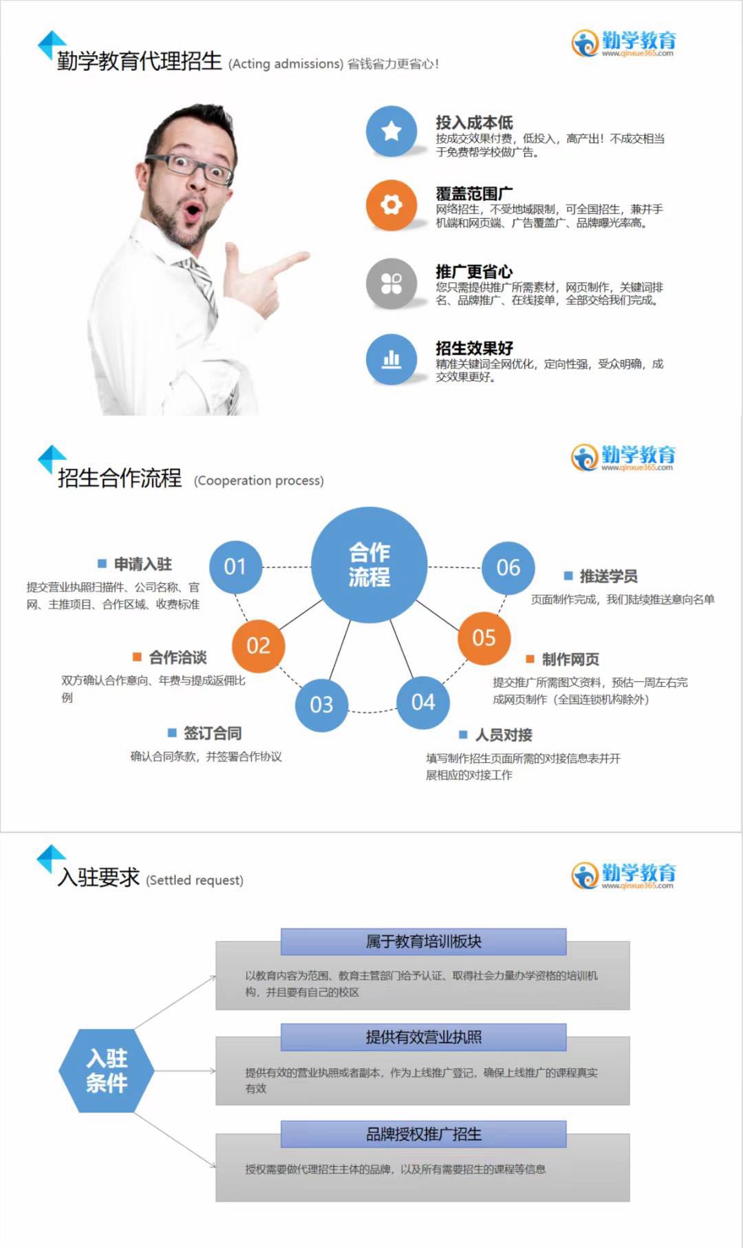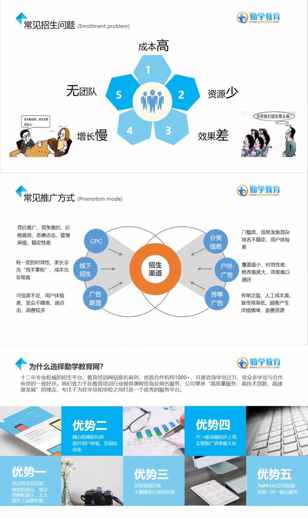 勤学网专业15年代理招生平台,帮助全国几万家教育机构获得更多生源,让成交率翻倍,品牌宣传等。合作项目有留学中介/语培,作品集/艺术留学,小语种,英语,口才礼仪,青少素质,会计,IT,设计,MBA考证研修,美容美发,K12,国际教育,建造工程,淘宝电商卫生/中医推拿,冬夏令营,等多类目机构。