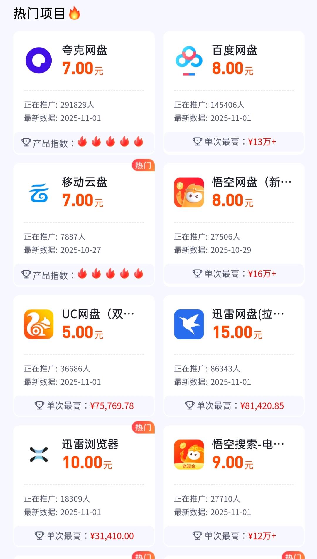 各类平台推广分成项目,百度网盘,夸克网盘,移动云盘,联通云盘,美团京东,小红书,汽水音乐cpe等,提供独立后台,全网高价